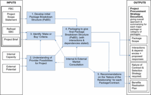 Buy the Contracts and Procurement Guide from here ! As well as having its overall scene-setting chapter, each chapter gives guidance on what to do at each stage. This includes a flow chart, which can either be used as a map for thinking things through or, for major projects, as a first level Work Breakdown Structure for each stage. An example of the one for the Project Procurement Strategy stage is shown given below.